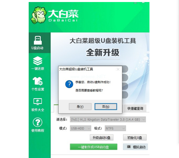 3.等待大白菜u盤啟動(dòng)盤制作完成提示,可以選擇關(guān)閉頁(yè)面,也可以查看教程。