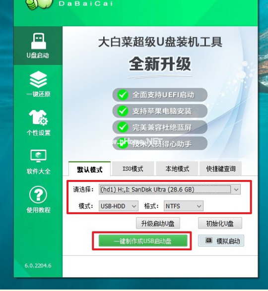 2. 將空白u(yù)盤接入電腦,自動(dòng)識(shí)別后,默認(rèn)USB—HDD和NTFS設(shè)置,點(diǎn)擊一鍵制作成u盤啟動(dòng)盤。