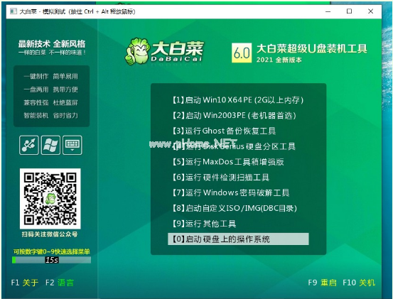 6. 頁(yè)面彈出測(cè)試畫面,則驗(yàn)證大白菜u盤啟動(dòng)盤主菜單則制作成功。