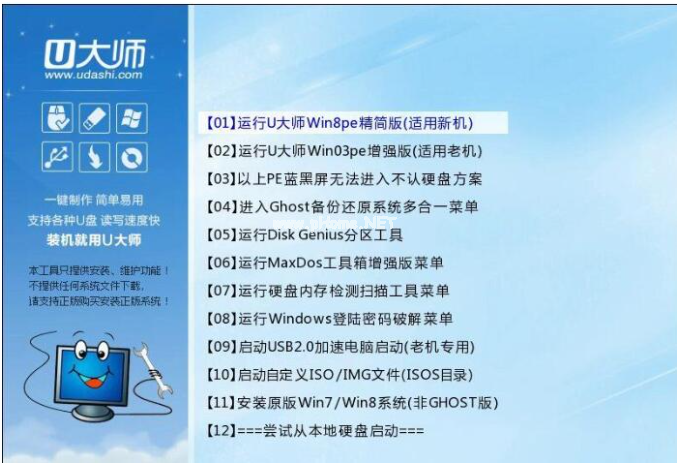 2.U盤啟動(dòng)進(jìn)入之后就會(huì)出現(xiàn)U大師選擇界面,選擇【01】運(yùn)行U大師Win8pe精簡(jiǎn)版(適用新機(jī)),然后回車。