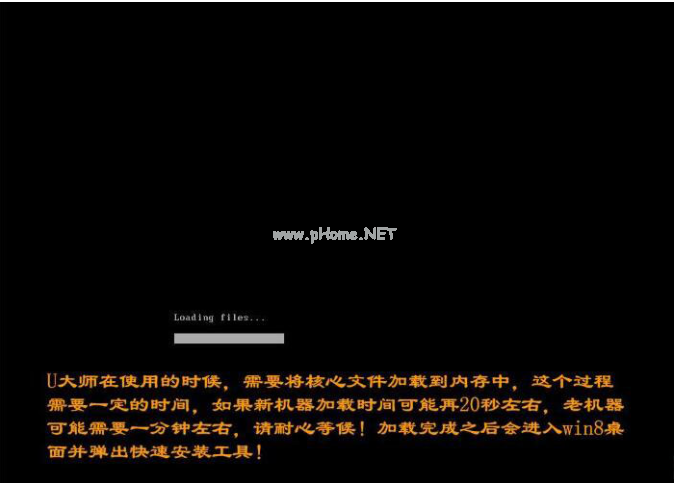 2、加載Win8pe,U大師在啟動(dòng)win8pe時(shí),需要加載到虛擬磁盤,新電腦加載一般比較快,大概40秒左右,老式電腦或者一體機(jī)大概2分鐘左右,加載完成后,自動(dòng)進(jìn)入到WIN8PE系統(tǒng)界面。