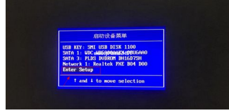 2.在啟動設(shè)備菜單窗口中,選擇“ENTER Setup”進行BIOS設(shè)置。