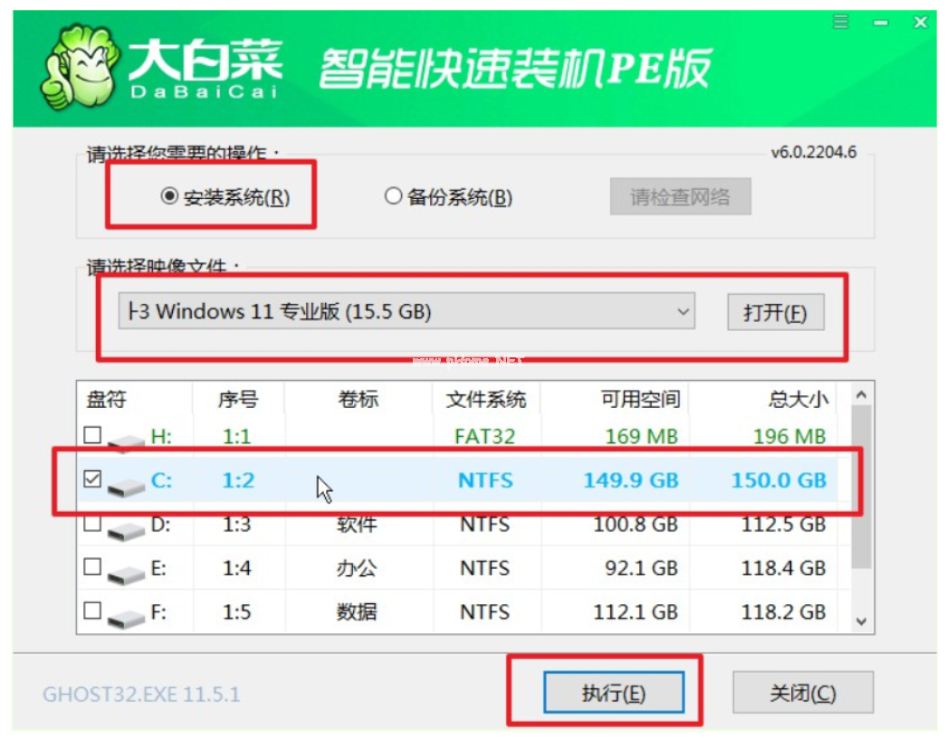 6、選擇安裝的系統(tǒng),選擇要安裝的鏡像文件,選擇要安裝的盤符,點擊執(zhí)行。