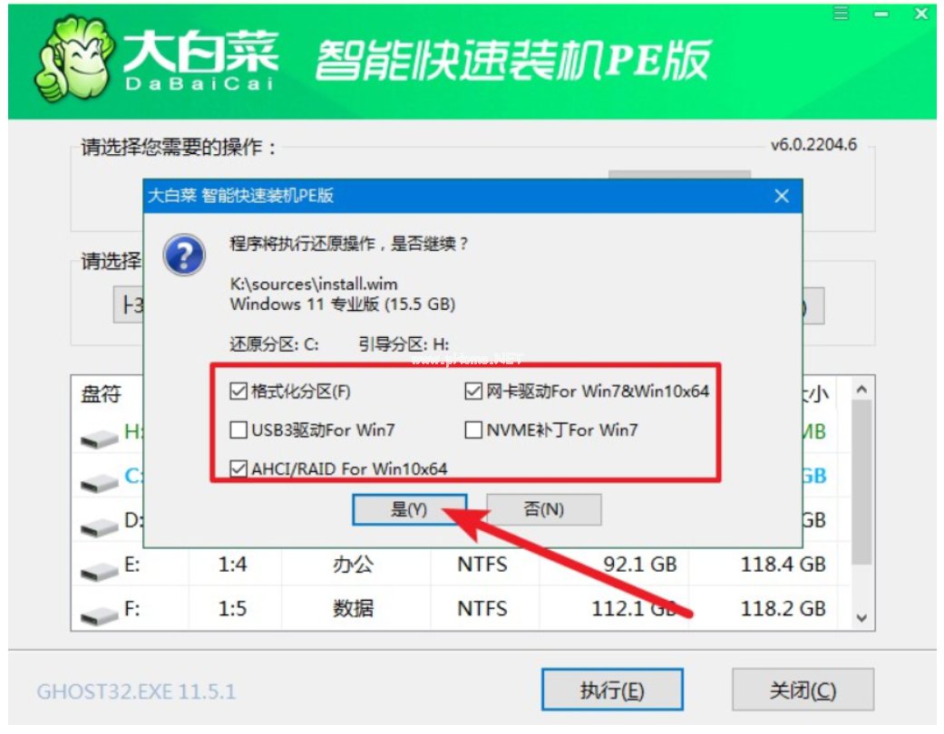 4.彈出還原提示操作時,默認(rèn)勾選,點擊“是”,進入新系統(tǒng)桌面后,完成。