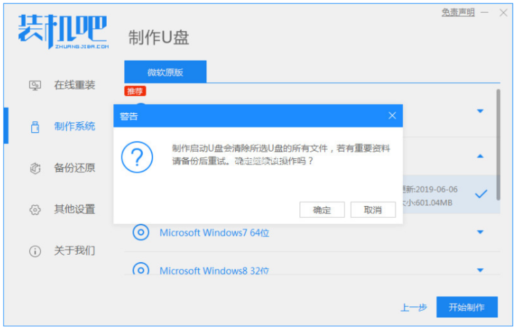 1、win7系統(tǒng)如何制作u盤啟動(dòng)盤呢?首先下載安裝裝機(jī)吧一鍵重裝系統(tǒng)軟件。準(zhǔn)備一個(gè)8GB以上的U盤。打開軟件,選擇制作系統(tǒng),在制作U盤界面中選擇自己的U盤,其它參數(shù)默認(rèn)直接開始制作即可。