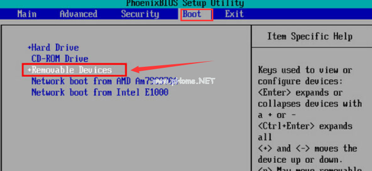 2、把光標(biāo)移動(dòng)到“boot”,找到u盤(pán)的選項(xiàng),這里是“removeble device”。