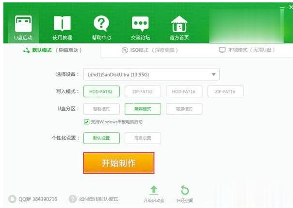 1.接著便會進(jìn)入制作的主界面,選擇設(shè)備選項會自動顯示插入的u盤型號,寫入模式、u盤分區(qū)、個性化設(shè)置都可以根據(jù)自身情況設(shè)置。設(shè)置完成之后點擊開始制作按鈕即可。