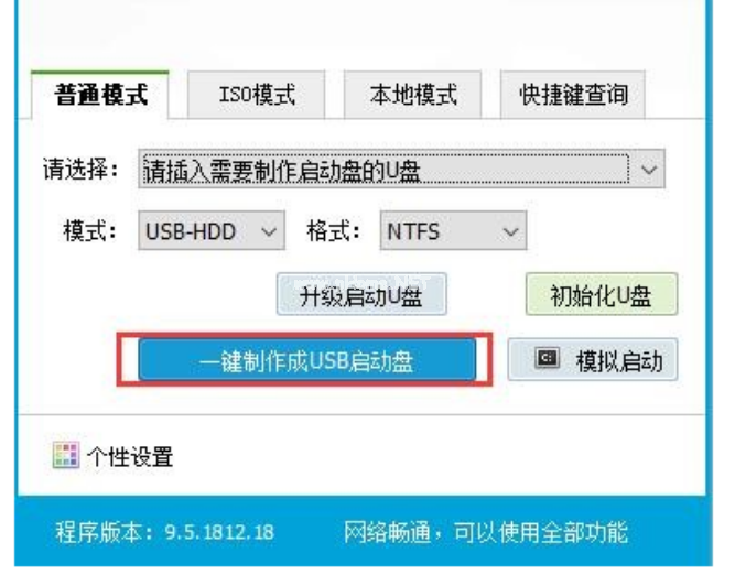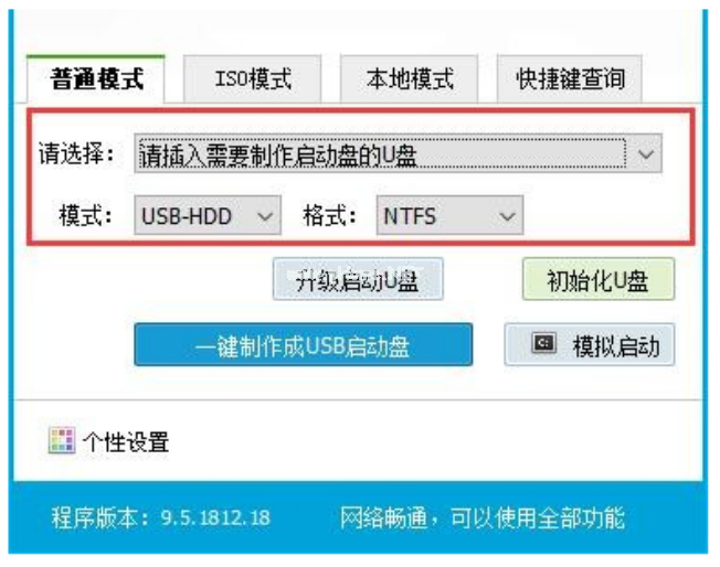 3、我們選擇普通模式選項(xiàng)卡,模式選擇USB—HDD,格式選擇“NTFS”。