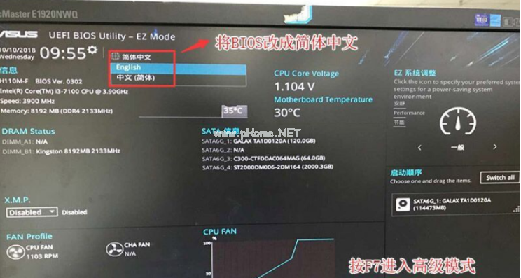 1、在開機的一瞬間,通常會顯示主板LOGO畫面,連續(xù)按Esc或F8進入Bios設置,將Bios改成簡體中文,最后按F7進入高級模式。