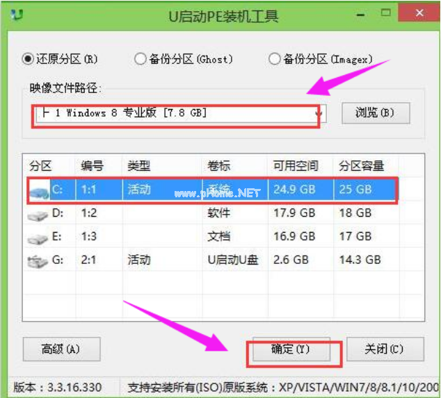 2、工具會自動開啟并識別u盤中所準備的系統(tǒng),建議參考下圖的內(nèi)容選擇系統(tǒng)版本以及磁盤安裝分區(qū),操作完成后點擊確定。