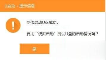 u啟動u盤啟動盤制作成功后會彈出提示信息窗口,提示是否要用模擬啟動測試u盤的啟動情況,可根據(jù)自身情況選擇。如圖: