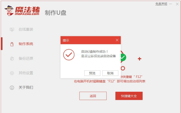 3.等待軟件制作u盤啟動(dòng)盤,預(yù)覽需要安裝的電腦主板的啟動(dòng)熱鍵,再拔除u盤退出。