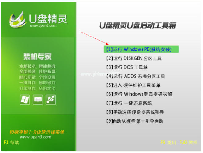 5、進入u盤精靈u盤主菜單,通過按上下鍵選擇第一項“【1】運行Windows PE(系統(tǒng)安裝)”,按回車鍵即可進入PE系統(tǒng)。