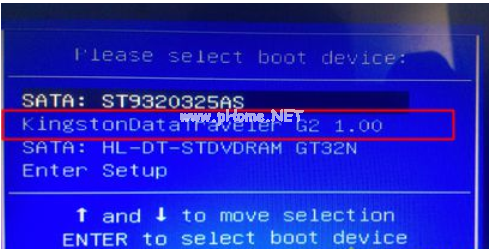 2、彈出啟動菜單,選擇第二項,即顯示u盤名詞或者usb類型字眼的選項,這里是“KingstonDataTraveler G2 1.00”,回車即可進(jìn)入u盤啟動。