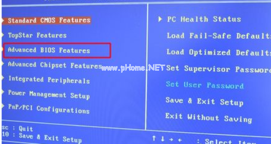 1、同樣開機重啟電腦,使用啟動鍵進(jìn)入bios界面,選擇“Advanced BIOS Features”,回車。