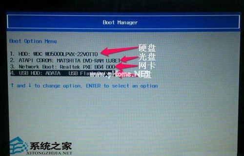 4,重新啟動電腦后,當進入標志畫面時,就可按F12快捷鍵,立即進入啟動菜單Boot Manager,在這里有四個選項啟動,1硬盤,2光盤,3網(wǎng)卡,4U盤,如果你想用U盤啟動,可以用上下方向鍵把光標移到第4項,然后按Enter鍵,就能立即從U盤啟動,如果用光盤啟動 ,同樣把光標移到第2項,按Enter鍵就可以了。