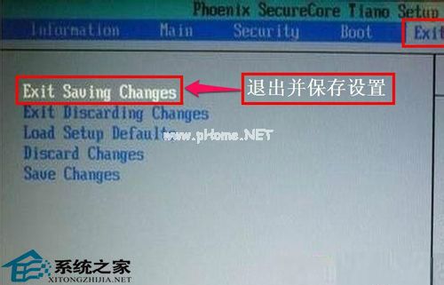 3,最后,當然要對設置進行保存,到BIOS主界面的Exit選項,在其界面里,找到Exit Save Changes這一項,中文意思是“退出并保存設置”,當然,我們也可以用更快捷方法,按F10就可以進行保存并退出了。
