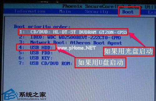 2,選擇BIOS主界面中的Boot選項,在Boot界面里,有七個選項,當然,由于BIOS版本不一樣,這里面顯示的項目也會不一樣,在這里,第四項USB HDD為U盤啟動項,第一項CD/DVD: HL-DT-ST DVDRAM GT20M-(PS)為光盤啟動項,要用U盤啟動,先用上下方向鍵把光標移到第四項USB HDD上,然后用F5/F6鍵,把它移動到最上面第一位,設置好后按Enter鍵確定。