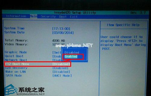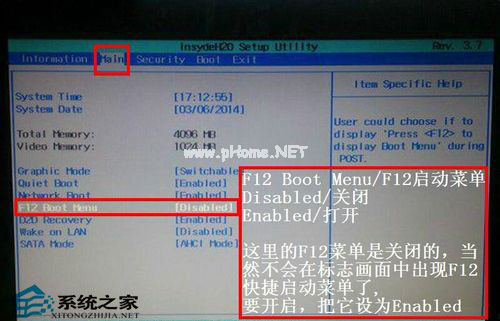 2,進入BIOS主界面后,在Main項下,找到F12 Boot Menu,其中文意思是“F12啟動菜單”,它現(xiàn)在的設置是Disabled(關閉),我們要把它打開,先把光標移到這一項上來,然后按Enter鍵。
