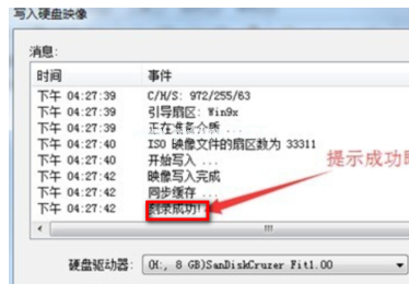6. 最后根據(jù)下圖箭頭所指,等待刻錄成功,這樣就成功制作DOS啟動盤。