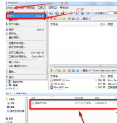 2. 第二步根據(jù)下圖箭頭所指,依次點擊【文件-打開】選項,在彈出的窗口中選擇【MSDOS71.ISO】。
