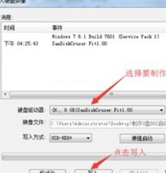 4. 第四步在彈出的窗口中,根據(jù)下圖箭頭所指,先將【硬盤驅動器】設置為U盤、【寫入方式】設置為【USB-HHD】,接著根據(jù)下圖箭頭所指,點擊【寫入】選項。