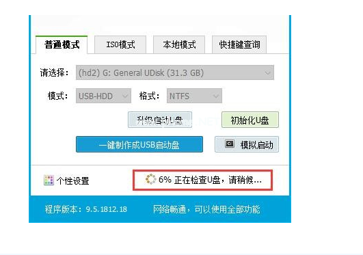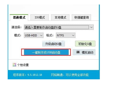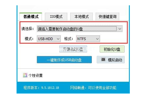 3.選擇普通模式選項(xiàng)卡,“請(qǐng)選擇”中選擇自身U盤設(shè)備名稱(一般會(huì)自動(dòng)識(shí)別)。模式選擇USB—HDD,格式選擇“NTFS”。