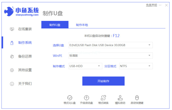 1、首先打開(kāi)小魚(yú)重裝系統(tǒng)軟件,選擇制作U盤(pán)開(kāi)始制作;