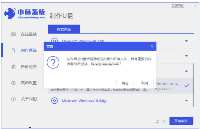 2、進(jìn)入到小魚(yú)系統(tǒng)的制作系統(tǒng)軟件界面,我們選擇制作U盤(pán)選項(xiàng),點(diǎn)擊開(kāi)始制作,系統(tǒng)此時(shí)會(huì)自動(dòng)給出適合安裝的版本。