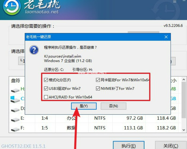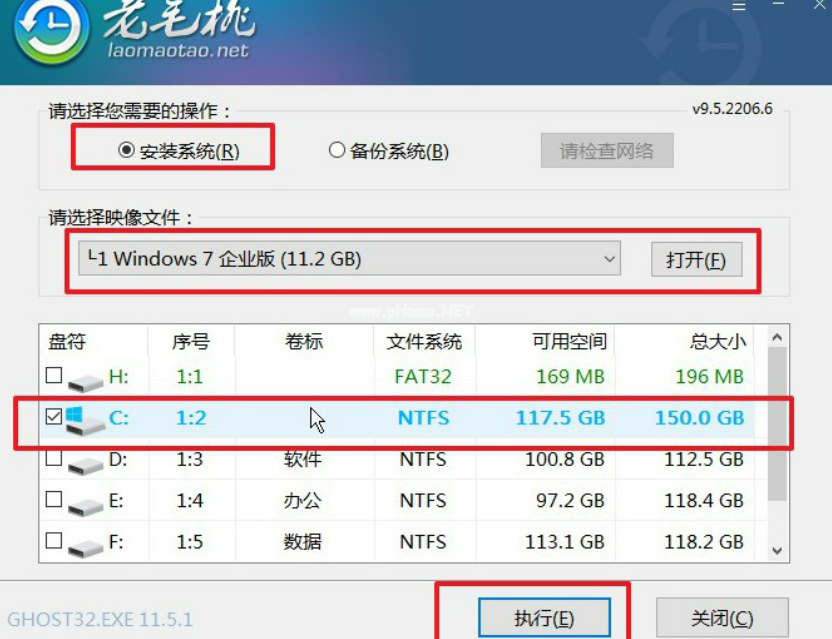 6、 在老毛桃winpe桌面中,打開老毛桃一鍵裝機,選擇u盤里面的Windows7系統(tǒng)鏡像,安裝在“C盤”,點擊“執(zhí)行”。