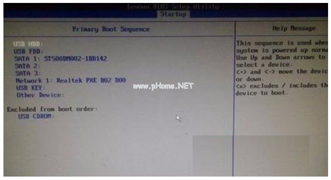 3,到這一步你可能會(huì)發(fā)現(xiàn),你要啟動(dòng)的項(xiàng)目在下方"Excluded from boot order"中,這個(gè)選項(xiàng)的意思為“未添加的啟動(dòng)項(xiàng)”,怎么把這個(gè)未添加的啟動(dòng)項(xiàng)啟動(dòng)上方啟動(dòng)項(xiàng)中呢,整個(gè)聯(lián)想BIOS操作界面當(dāng)中,沒(méi)有給提示,所以很多用戶到這里就不會(huì)選擇了。