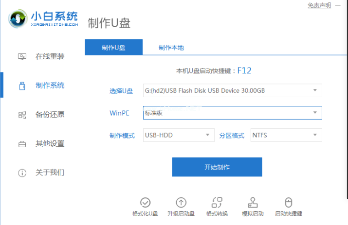 1、打開(kāi)小白一鍵重裝系統(tǒng),選擇制作U盤(pán)。