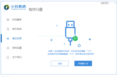 5、提示U盤(pán)制作完成后,點(diǎn)擊快捷鍵大全,去網(wǎng)上提前找好自己的熱鍵。