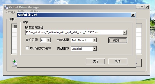 6、裝載映像文件:點擊裝載,找到你的U盤上的ISO文件,路徑瀏覽記住虛擬盤符為A,確定后,最小化放在任務(wù)欄邊