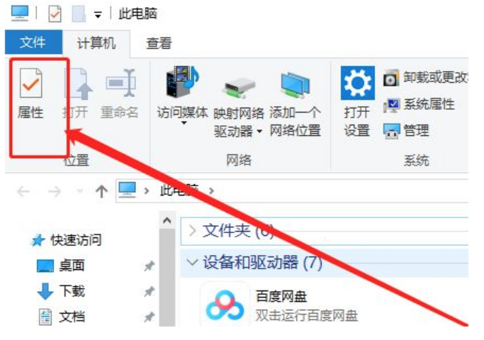 1、將U盤插入電腦,然后打開此電腦,選擇左上角“屬性”。