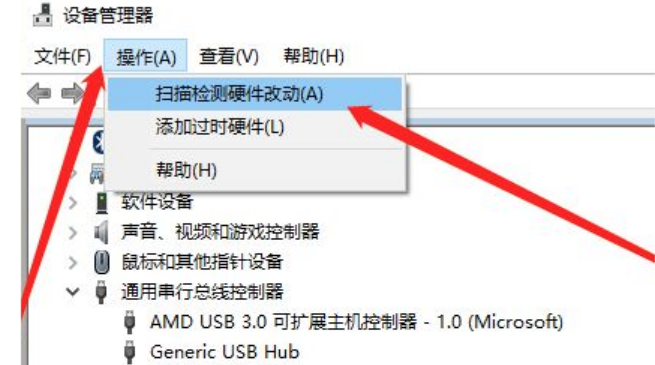 6、USB大容量存儲設(shè)備消失之后,點(diǎn)擊上面“操作”,彈出選擇“掃描檢測硬件改動”。