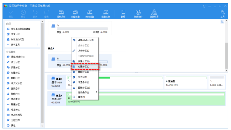 傲梅分區(qū)助手是一款免費磁盤分區(qū)工具,它沒有上述工具的那些限制,它提供了一個友好的用戶界面,即使您是計算機新手也都能輕松上手。例如,您想創(chuàng)建新分區(qū),只需右鍵單擊具有可用空間的分區(qū)或未分配的空間,然后從下拉菜單中單擊“創(chuàng)建分區(qū)”,再根據(jù)提示操作即可。
