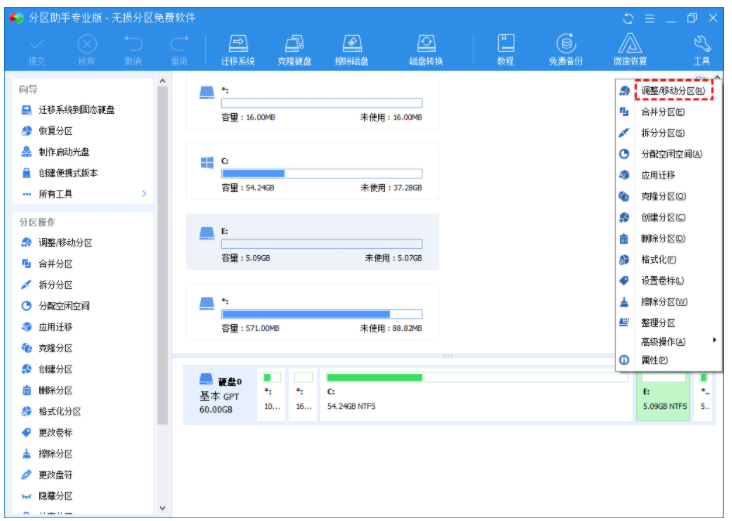1. 打開傲梅分區(qū)助手。右鍵單擊E盤,然后選擇“調(diào)整/移動分區(qū)”。
