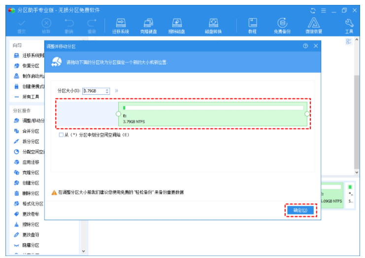 2. 通過拖動左側(cè)圓形按鈕來縮小E分區(qū)大小,并點擊“確定”按鈕。