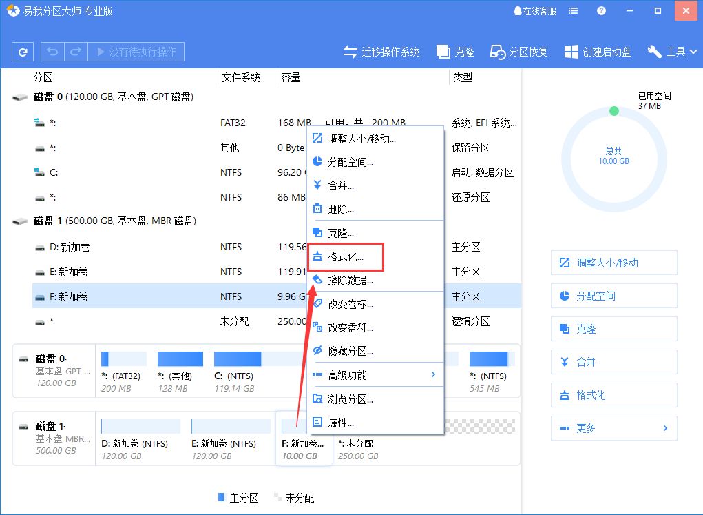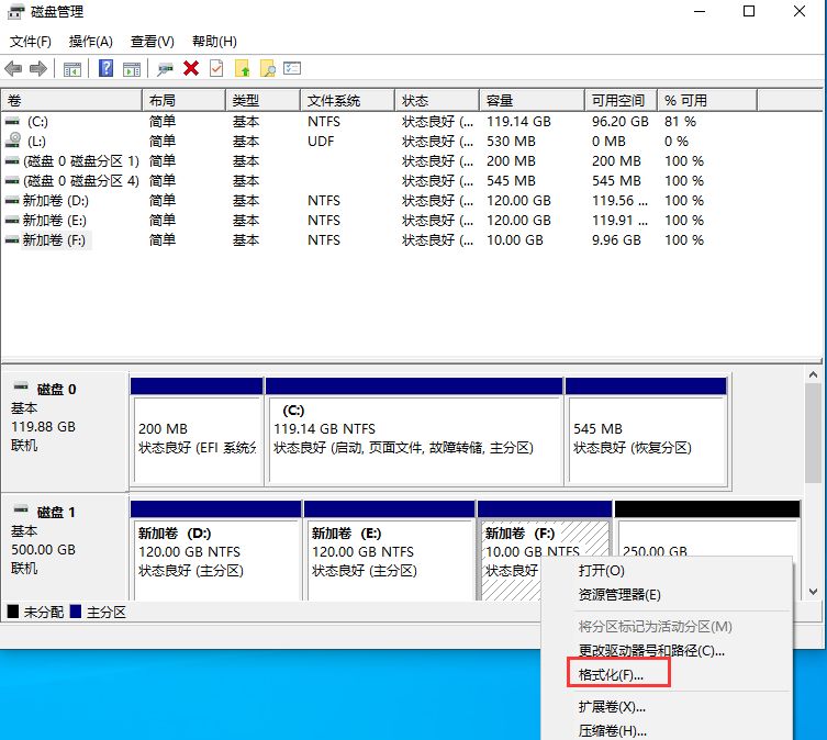 (2)選擇需要格式化的分區(qū),右鍵,選擇“格式化”選項(xiàng)