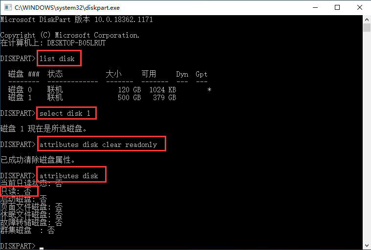 attributes disk clear readonly(清除磁盤屬性,解除寫保護(hù)狀態(tài))