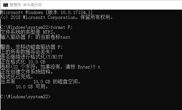1、通過(guò)命令格式化:以管理員身份打開(kāi)命令提示符,輸入format F:(F是需要格式化的分區(qū)),回車,根據(jù)提示操作,耐心等待一會(huì)兒,就可以看到格式化完成啦。