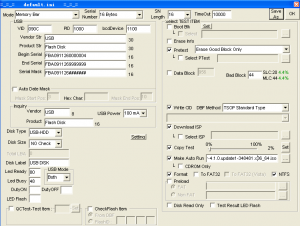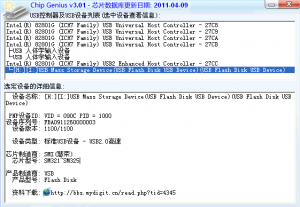 將u盤插上,啟動(dòng)下載的軟件,如圖1所示.一般程序會(huì)自動(dòng)將焦點(diǎn)鎖定u盤盤符,在下面框里可以看到芯片型號(hào).我那08年的u盤芯片為smi32x的.