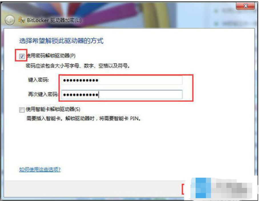 2、勾選使用密碼解鎖驅(qū)動(dòng)器,輸入密碼,點(diǎn)擊下一步。