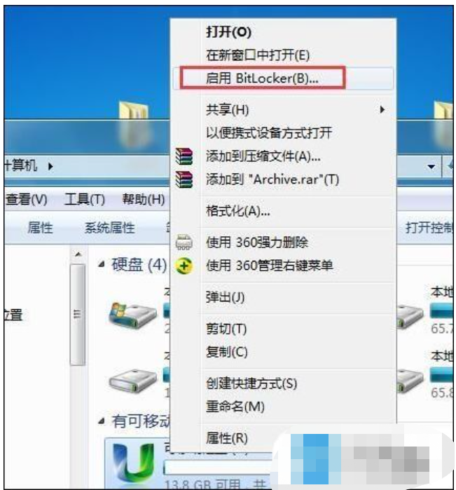 1、將u盤插入電腦usb接口,找到u盤盤符并右鍵點(diǎn)擊該u盤,點(diǎn)擊啟用BitLocker。如果右鍵找不到這項(xiàng),可以點(diǎn)控制面板-BitLocker驅(qū)動(dòng)器加密,選擇插入的u盤即可。