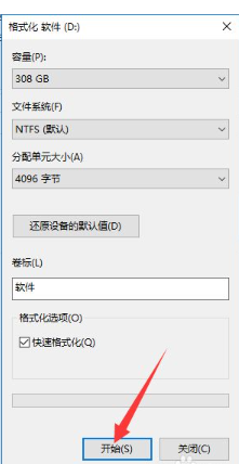 4、會(huì)彈出窗口,這時(shí)我們選擇格式化,點(diǎn)擊“開始”。