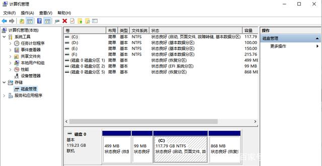 2、在彈出的“計(jì)算機(jī)管理”中點(diǎn)擊左側(cè)的“磁盤管理”,這時(shí)候右側(cè)面板里會(huì)顯示當(dāng)前電腦上的所有磁盤信息。
