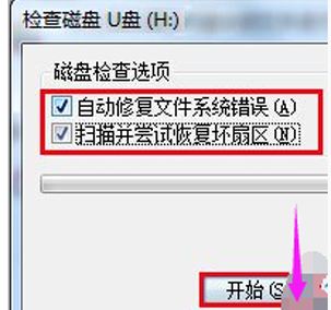 3.勾選所有選項,然后點擊開始,耐心等候進行U盤的修復(fù)工作。