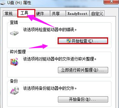 1、進入U盤屬性,檢查修復(fù)磁盤;