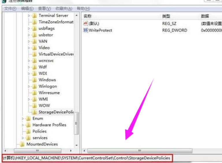 2、進入注冊表編輯器后我們依次找到:HKEY_LOCAL_MACHINE\SYSTEM\CurrentControlSet\Control\StorageDevicePolicies。